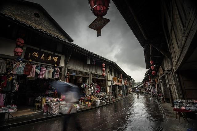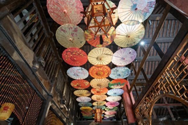 抬头望去,那茅屋采椽的屋檐下,挂满了五彩斑斓的油纸伞和红色灯笼。油纸伞上精美的图案,仿佛在讲述着古老的故事;红色灯笼散发着温暖的光芒,在天空漫射光影的映衬下,就像朵朵缕缕彩云,绚丽夺目。这一片靓丽的貌颜,不仅是视觉上的享受,更是心灵的慰藉,让人沉醉其中,难以自拔。